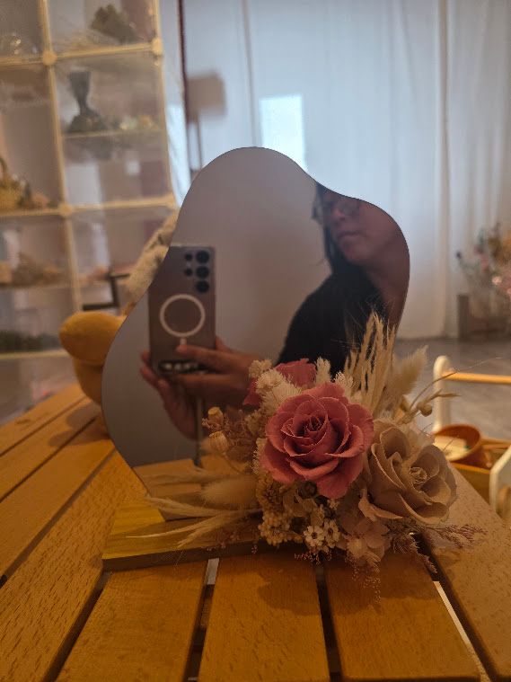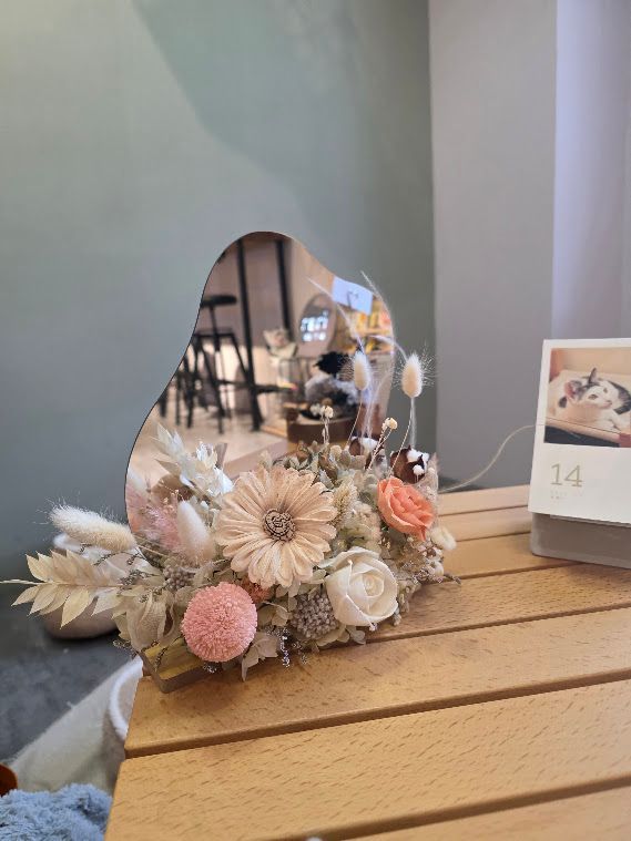 每個女生的梳妝台上,都應該有一面溫柔的鏡子。 花絆伴【絆 ‧ 浮光】系列,選用優雅的不規則異形鏡,如湖泊般靜謐流動。 我們在鏡畔植下不凋的玫瑰與索拉花,讓花朵的姿態透過鏡面折射, 虛實交織間,彷彿將整個春天的光影都揉進了室內。