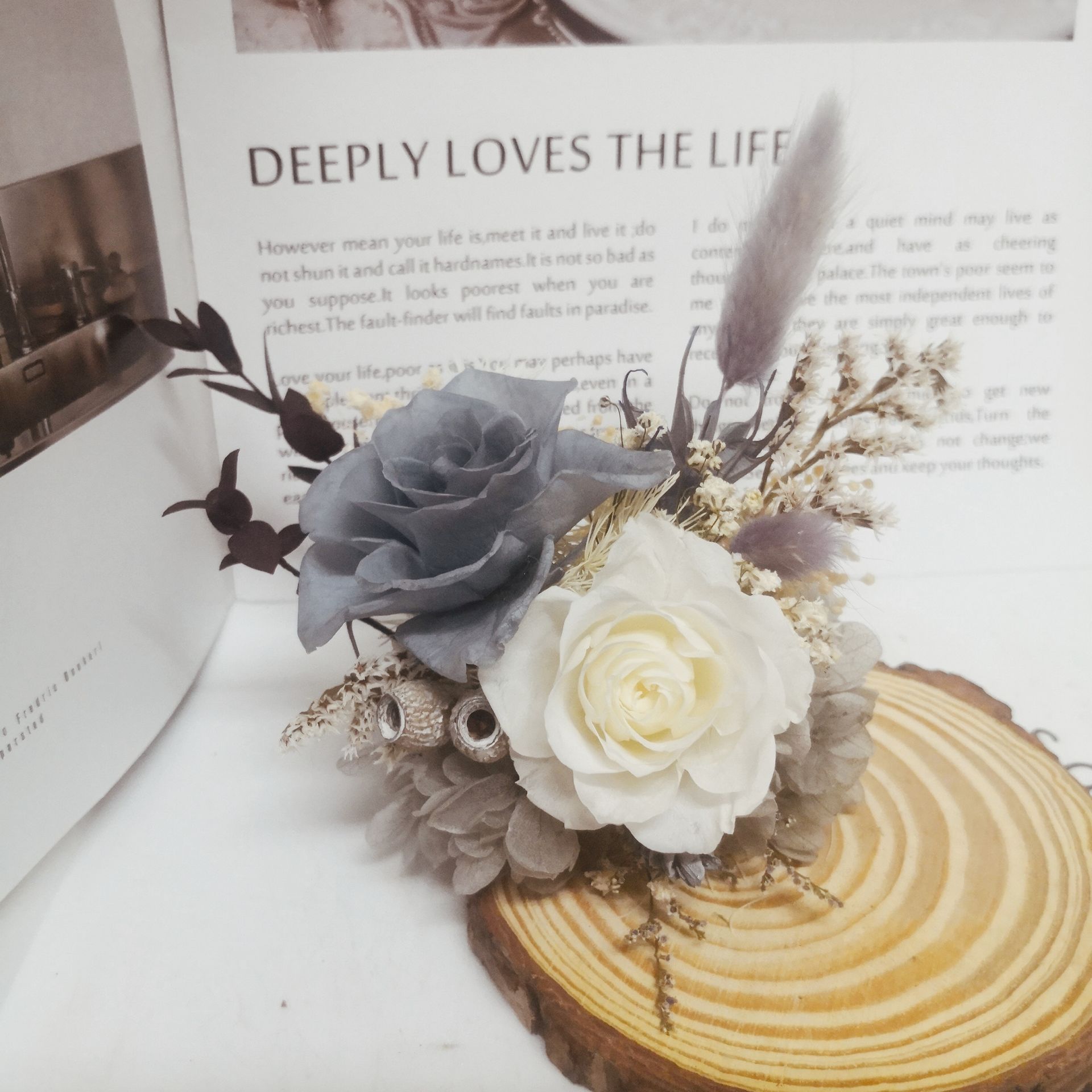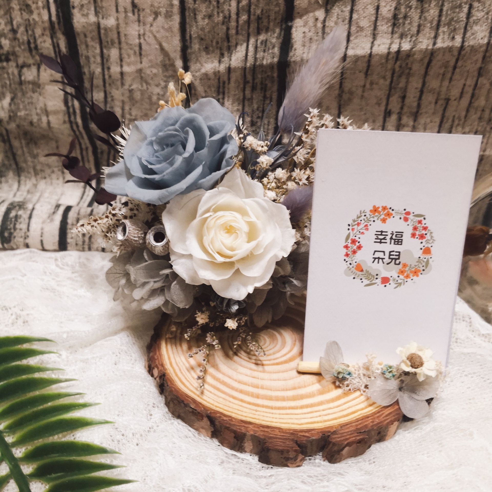 花絆伴將名片座與永生花結合,創造出這款兼具實用與美感的「職場藝術品」。