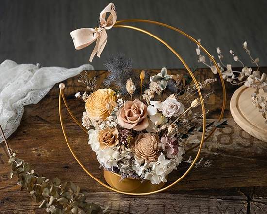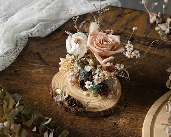 選用天然乾燥花與永生玫瑰,層疊出深淺不一的大地棕與暖米色調。 棉花的蓬鬆、葉脈的細膩與玫瑰的柔軟, 在異材質的碰撞中,展現出一種內斂的奢華。 無論是搭配大理石檯面還是木質餐桌,都能瞬間提升整體的設計感。